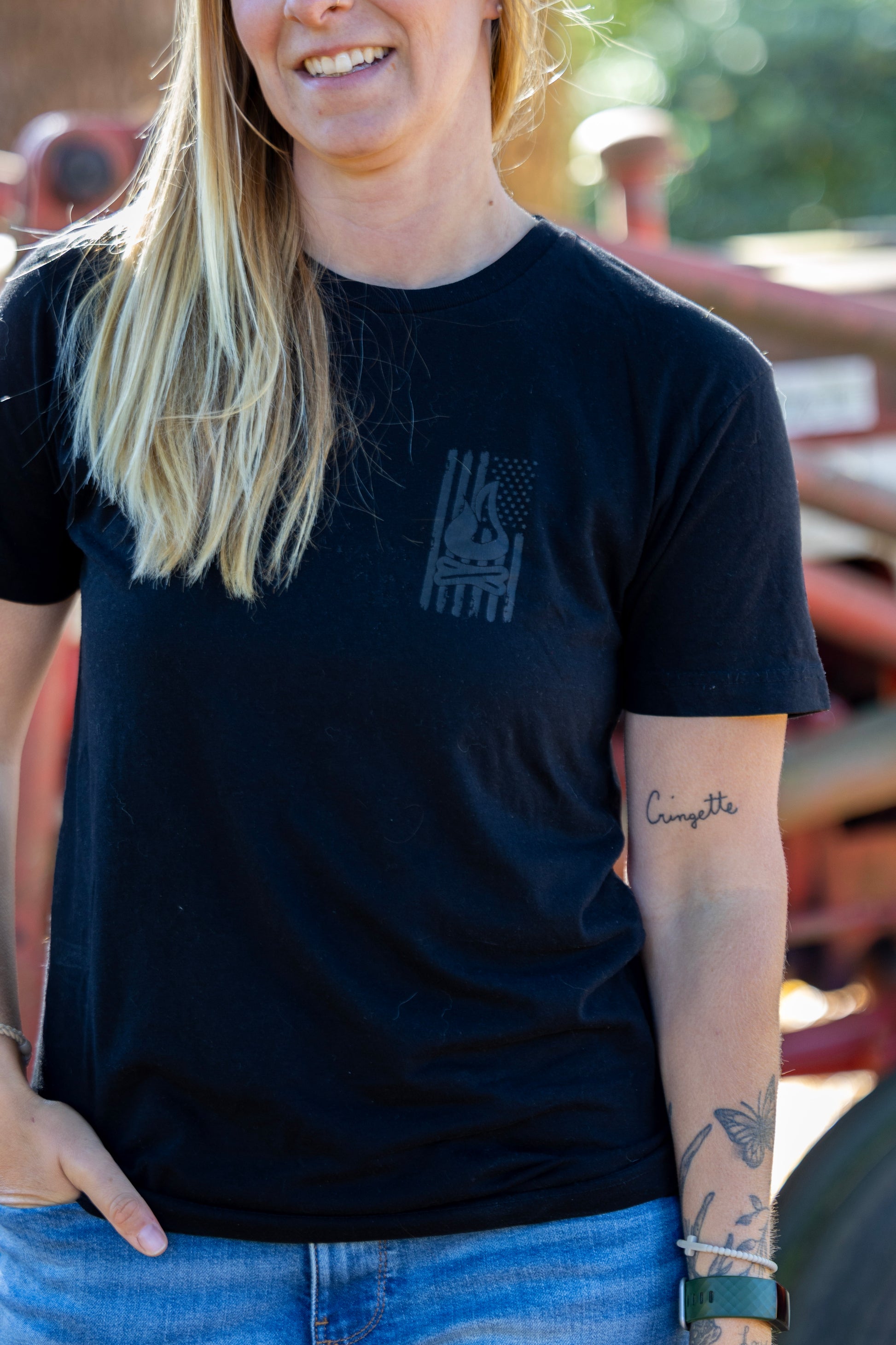 Black tee with black ink. It is really a unique look and we can't get enough with our distressed bonfire flag design.
