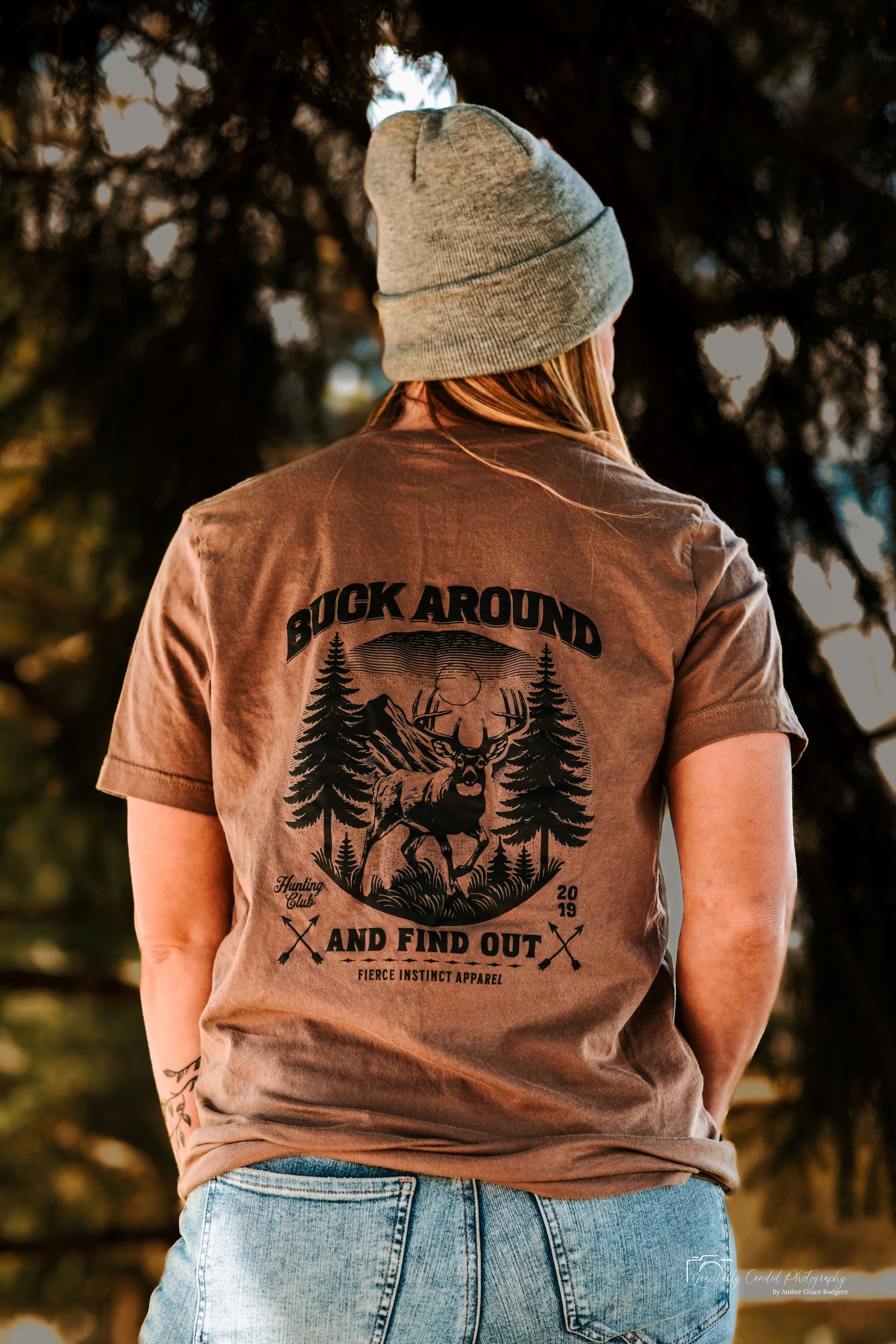 Buck around and find out tee. Printed front and back with our new FI logo on the front. Printed on a vintage brown color. Unisex sizes.