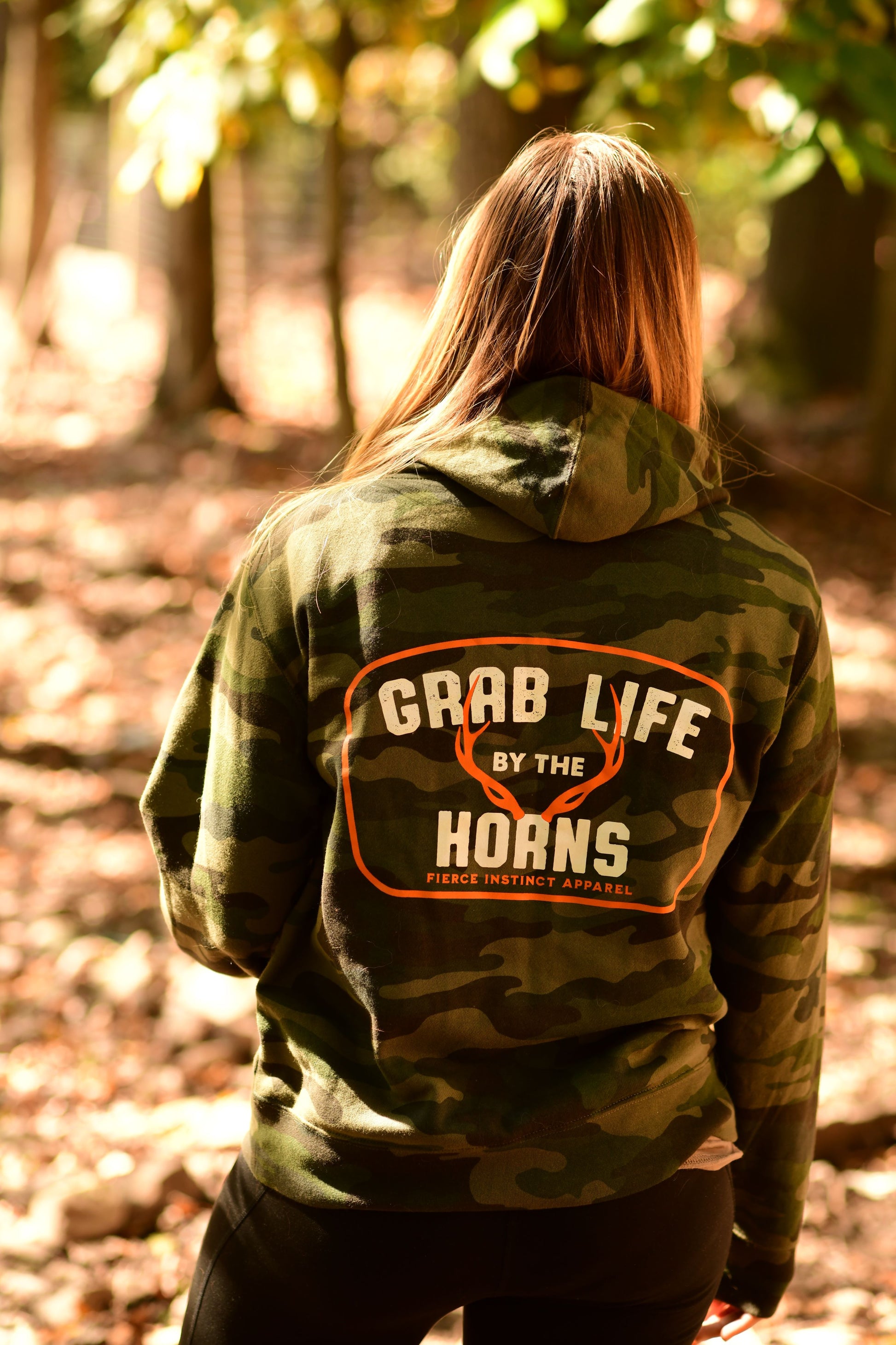 Redesigned! Our Grab Life by the Horns design in this bold patch style on a traditional camo hoodie.