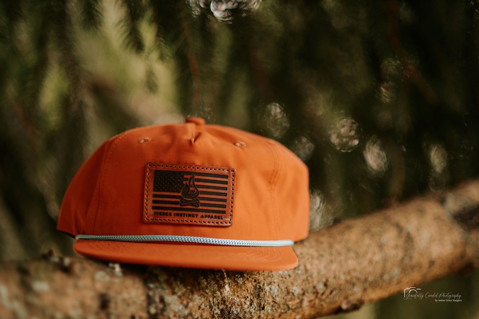 Orange nylon snapback one size fits most with our Bonfire Flag logo