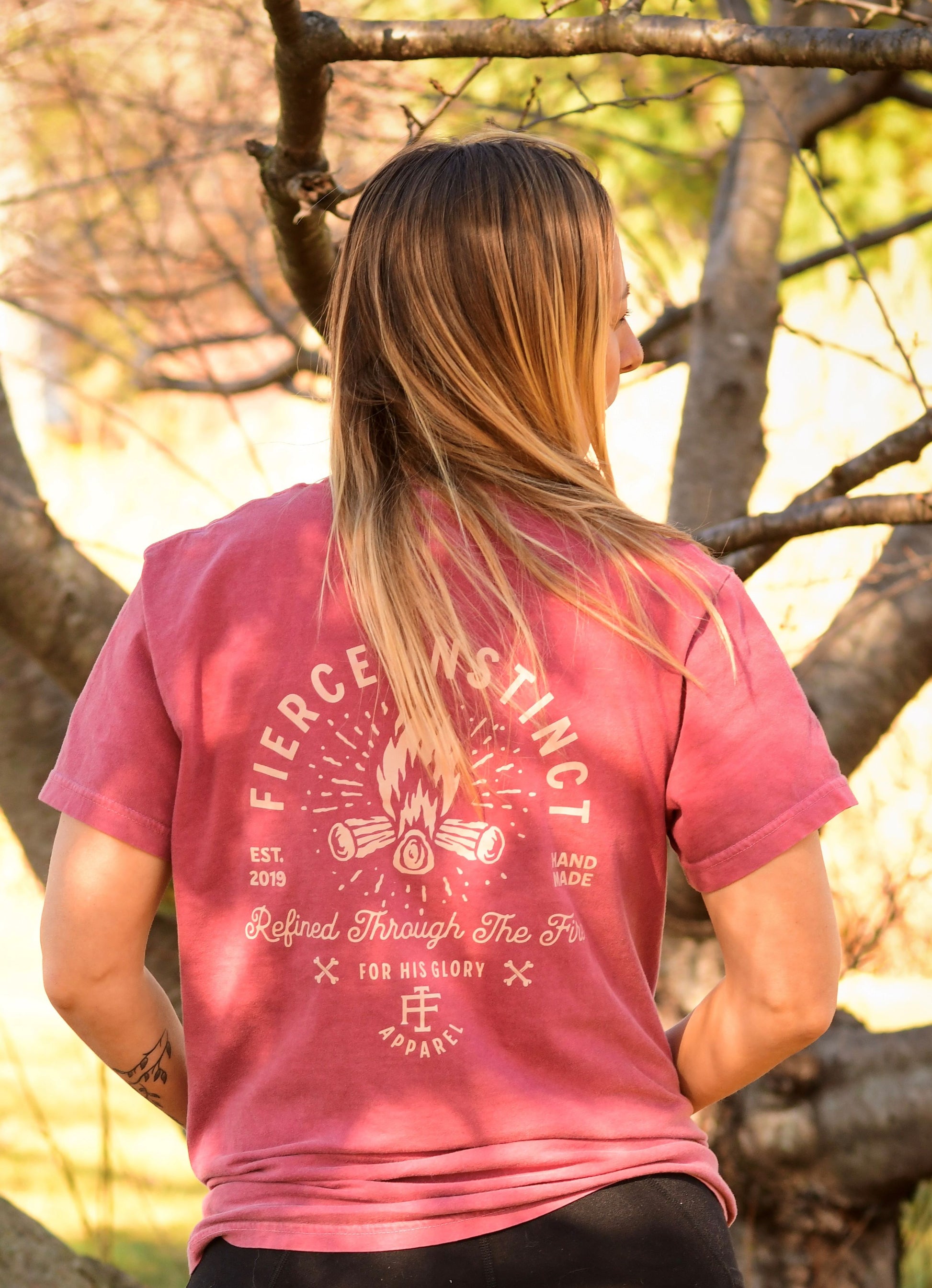 Refined through the fire. On your choice of comfort colors Brick or Navy colored tee. All tees are unisex sizes. Printed with a tan ink