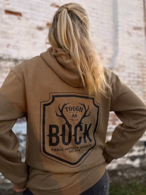Tough As Buck design printed on a camel-colored unisex hoodie. Perfect for guys and gals. Printed on front chest and full back.