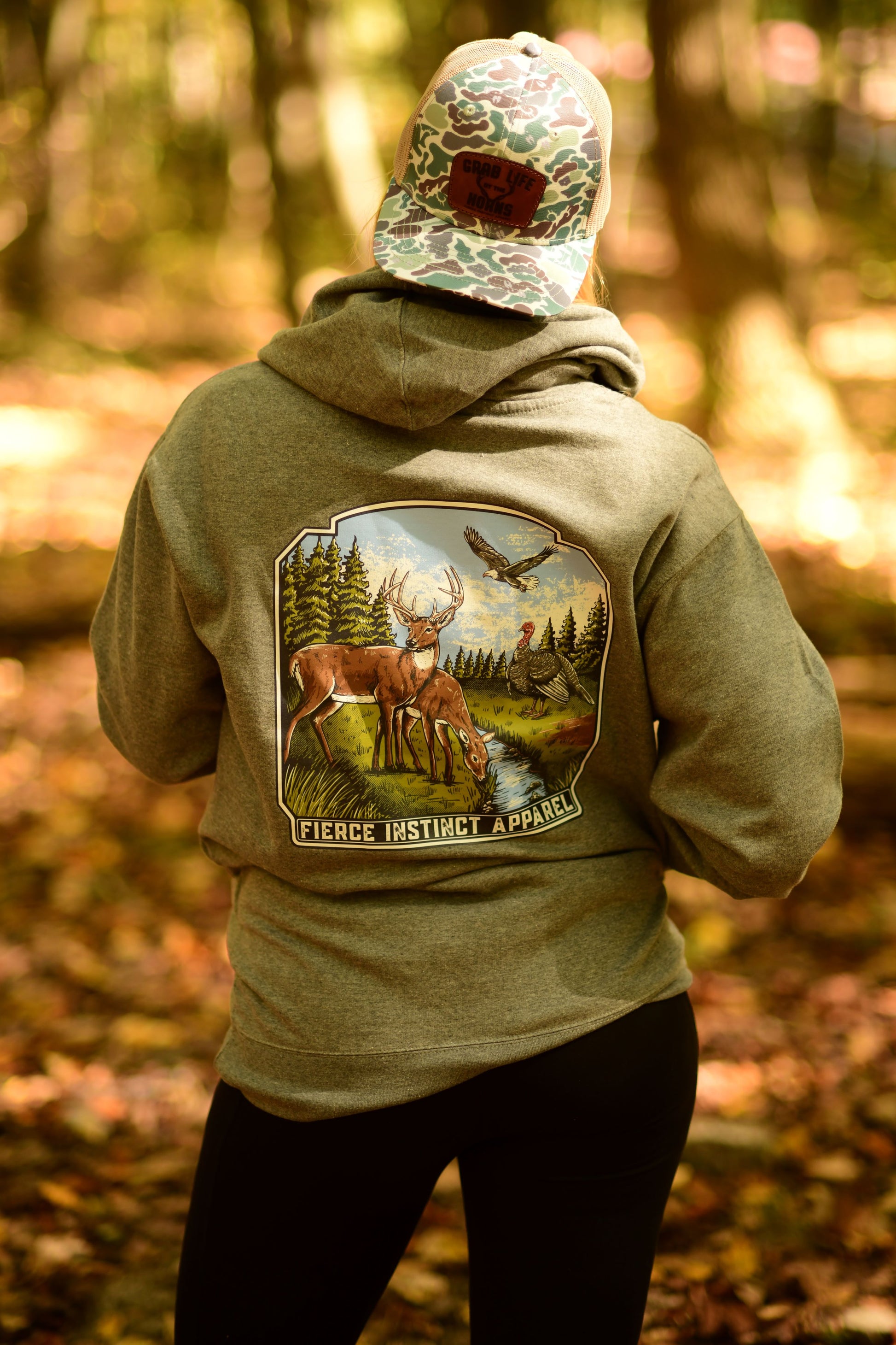 Wildlife design depicting the great outdoors. Choose from a hoodie or a crew neck sweatshirt. These need to be washed inside-out to maintain the color vibrancy. Unisex sizing.
